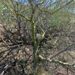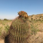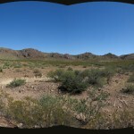 I set out for the nearest butte, across rolling desert terrain cut by shallow arroyos, featuring big honey mesquites alongside big catclaw acacias, with an understory of junipers, creosote bush, barrel cactus, prickly pear, ocotillo, palo verde, and various shrubs. A diverse paradise for lovers of desert vegetation. As with other areas I’ve explored nearby, the arroyos here often expose bedrock, and although the ground was already bone dry, yesterday’s storm had left hundreds of small tinajas – water pockets – in that bedrock.