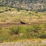 This even less-traveled road led back into a beautiful box canyon on the north side of the crest I’d hiked last winter. It dead ended at a stock dam, windmill, and water tank at the foot of the mountains, with a huge bull and a cow lounging a dozen yards apart – an odd couple to find isolated and alone like this.