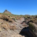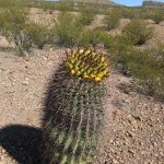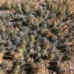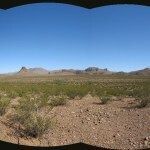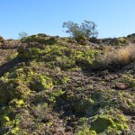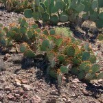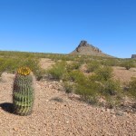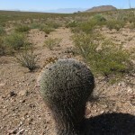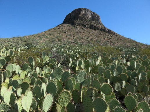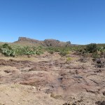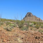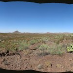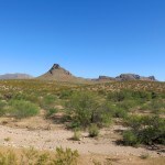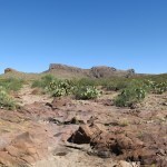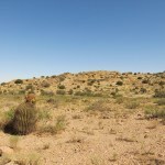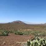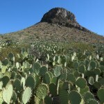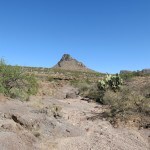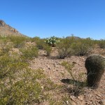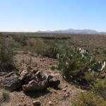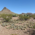 The dry wash I was following turned away from the butte, so I climbed a shallow rise into the next watershed, and found a picturesque little box canyon at the foot of the butte. Crossing the head of that, I traversed the shoulders of the butte northward to get a view of the northern part of the basin. Big prickly pears surround the butte, creating an obstacle course that was sometimes almost impassable, but it was all so pretty I didn’t mind. My only regret was the lack of clouds – I’ve passed this area when cloud cover made it look more epic than it is – almost like Monument Valley in Utah.