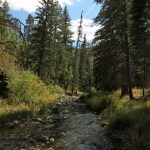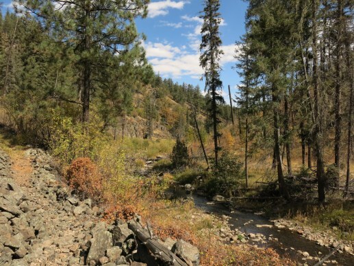 I picked this remote hike because I needed to protect both the recent shin splints and the long-term knee issue, and this is one of the few pretty hikes in our area that doesn’t involve big elevation changes. I wasn’t thinking of the fall color, but that turned out to be a bonus. We’re at the tail end of a severe drought, so I was surprised to see all the creeks still running.