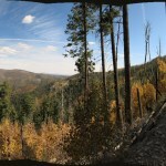 Finally, I reached the turnoff for the backcountry road west, and left the crowd behind. The single-lane dirt road traverses a maze of ridges and canyons between 6,000 and 6,500 feet, forested with ponderosa pine and Gamble oak, up and down around hairpin turns. RVs, fifth-wheelers, and pickups with camper shells were sporadically tucked away under the pines, and I passed at least one group of camo-clad hunters setting up camp.