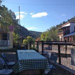 My next goal was the tiny restaurant in the ghost town at 6,600 feet. They’re only open on weekends, spring through fall, because the road closes in winter. Basically a burger place, they have counter service inside with tables outside beside the creek, which has been channelized for flood control. It was a perfect chance to chill after the arduous road over the crest and before the final dangerous one-lane descent to the highway.