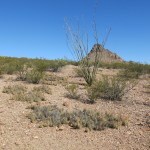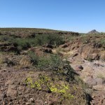 Eventually I turned back. I needed a little more mileage, so when I reached the head of the box canyon I turned upstream. This proved to be a good choice – the arroyo led me over more spectacular bedrock formations and into the eastern part of the basin below more rugged rock bluffs. I saw a phainopepla and flushed a covey of quail and several ground squirrels.