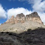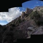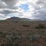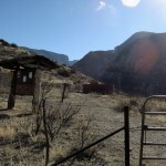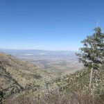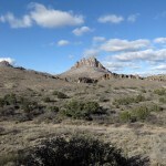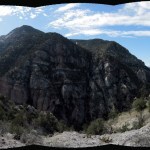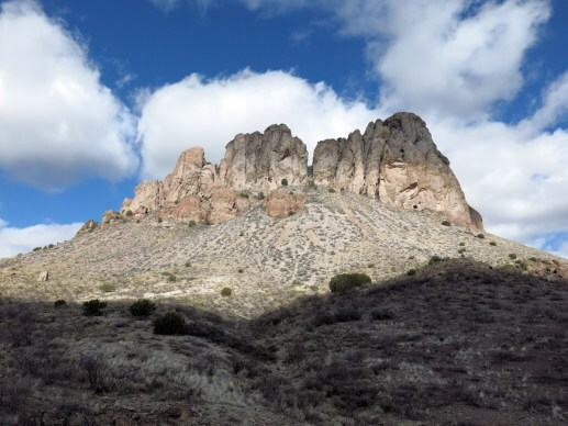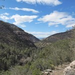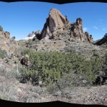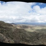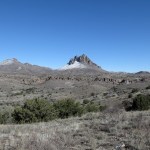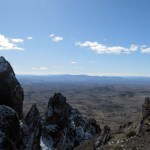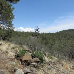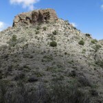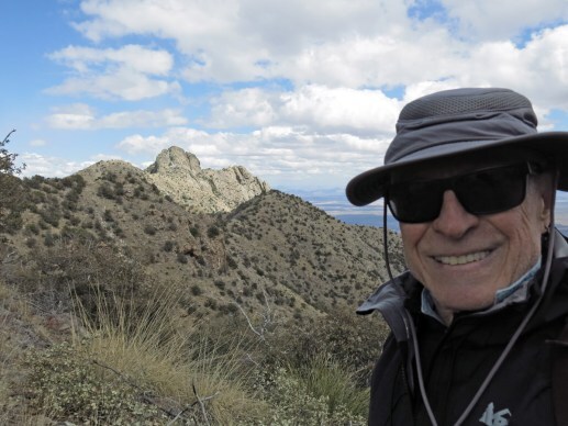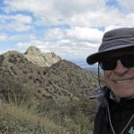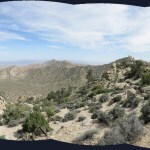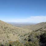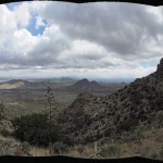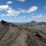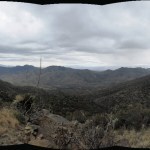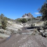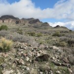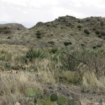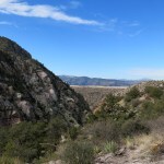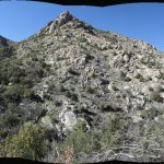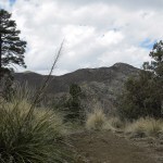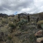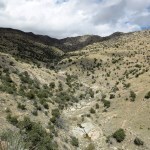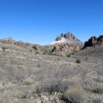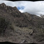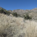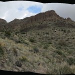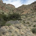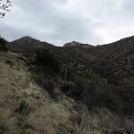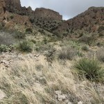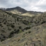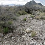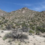 Past the bluffs I emerged in a sort of overgrazed bajada, a rocky expanse of cactus, grass and mesquite that was at first like a superhighway leading toward the base of the peaks. Farther up, it was divided into ridges and gullies so I had to pick a route, but I came upon a well-marked cattle trail that led me up to an old fence and gate that divided this from the grazing on the north side of the peaks. The gate clearly hadn’t been opened for years and took all my strength to re-close.