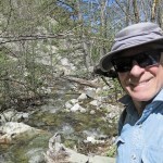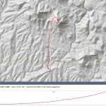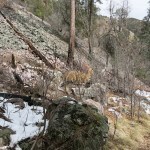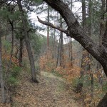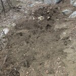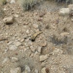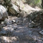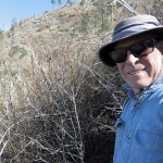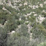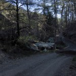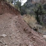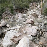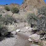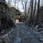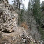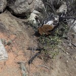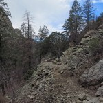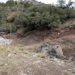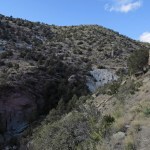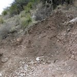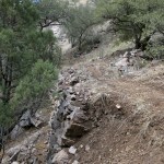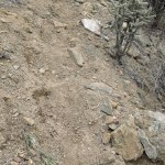 Now I was in view of the rock towers on the high ridge between the two canyons. And in a third of a mile I expected to reach another trail that comes down the north slope at my left. The upper part of that trail is an abandoned mine road that had long been washed out and buried in debris – I’d descended it two or three times shortly after moving here, to reach a swimming hole in the creek. But now, when I reached the biggest washout, I discovered someone had recently brought a Caterpillar down the road, clearing it and filling the washout in the trail.
