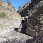 I began encountering what would turn out to be a series of natural rock dams across the canyon bottom, some requiring technical bouldering moves to climb over. And suddenly I found myself at a fork in the canyon, where two branches of seemingly equal size converged. One featured a towering cliff and a narrows that looked potentially impassable, so that’s the one I tried.
