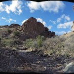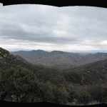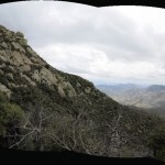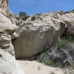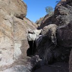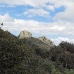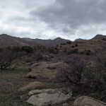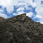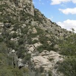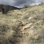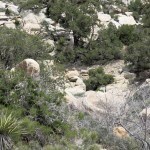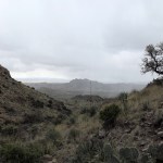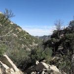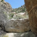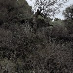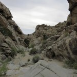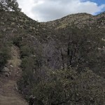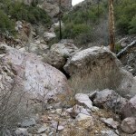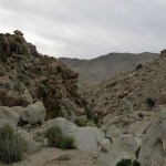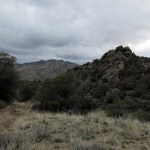 Weather had been moving around the landscape all morning. I’d been hiking across open country and wasn’t worried about finding my way back until I reached the steep canyon. Working my way up the first wash I came to, I had to divert up the opposite slope to bypass boulders and big oaks, and discovered the canyon bottom was divided into two parallel washes by a tall debris pile running down the center. The washes were choked with boulders and vegetation, and the debris pile consisted of jumbled boulders that were really slow going.