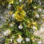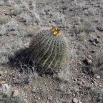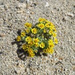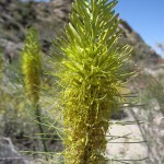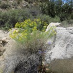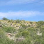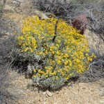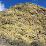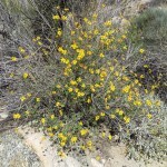 The day was forecast to be clear, with afternoon temperatures at the trailhead reaching the 80s. My vehicle’s air conditioning was destroyed when I hit a deer two years ago, and on the back road that leads to the trailhead, it was warm enough already that I had to roll down my side window. There, I was amazed to discover brittlebrush – encelia farinosa, one of my favorite spring wildflowers in the Mojave Desert – covering the foothills.