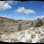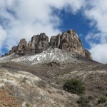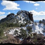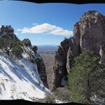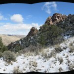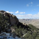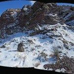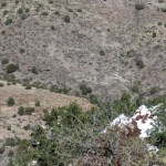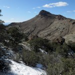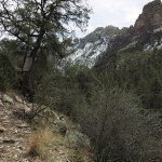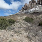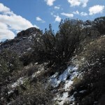 Now I was nearing the saddle between the two peaks, and needed to start traversing up the slope of the right-hand peak. I didn’t know what I would find on the north side and I wanted to start gaining some elevation while I could. It was a 20-degree slope, and I began encountering snow, but had thankfully left the mesquite behind.