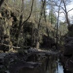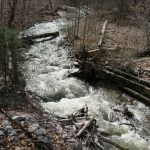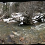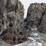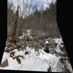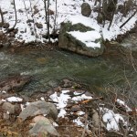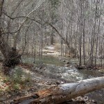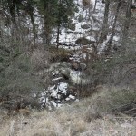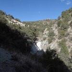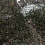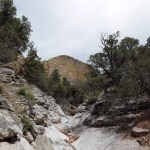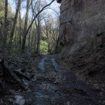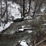 I’d expected the creek to be in flood, and I wasn’t wrong. The newly cleared trail up the side canyon is a little over a mile beyond the junction, past a big washout that had stopped me in the past. Sure enough, last fall’s trail crew had cleared a path across the washout, but when I reached the mouth of the side canyon, about thirty feet of icy, foot-deep water separated me from the opposite trail. I would have to continue up the main canyon.