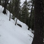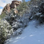 As I rounded the corner toward the north side, I could see a towering fin of reddish rock blocking my way ahead. Between me and the fin lay a steep snow-covered slope heavily forested with pinyon pine – this would be my only route to the crest. The grade was more than 30 percent, and the trees appeared to get thicker toward the top.