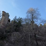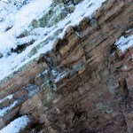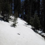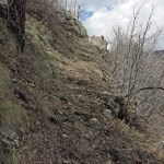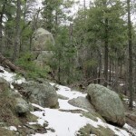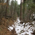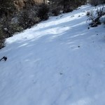 That forest lay mostly in the shade, so I didn’t mind the effort of climbing – it kept me warm! But the ground beneath the 4-inch-deep snow consisted of loose gravel or scree so there was a lot of slipping. The steep grade required me to sidestep most of the way, zigzagging between trees.
