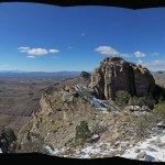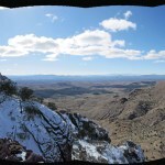 It was a very recent fence, and as I approached it I saw it crossed a rock pile where I could probably step over it. The wind was howling through here, too, but mercifully carrying no sleet. Once past the fence, I saw the peak rising at my left. It was a steep climb in wind that constantly threatened to topple me on the rocks, but I’d come this far and wouldn’t be stopped. At my right was the edge of the caprock and a dropoff of nearly two thousand feet, but I didn’t even glance at the view until I’d actually reached the top.