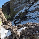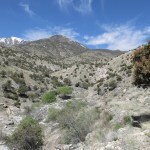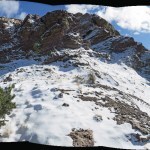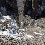 I estimated I’d gone between three and four miles in 3-1/2 hours – about what you’d expect while routefinding and bushwhacking new terrain. The alluvial slopes had gone quickly, but the slot canyon and snow-covered upper slopes had gone very slow. I expected the descent to be treacherous.