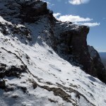 I was intrigued by a narrow gap in the cliffs above, a slot that appeared to contain a steep chute that might be a shortcut to the crest. But I could see snow in there, and I had no idea how technical it would get up close, so I filed it away and kept traversing.