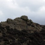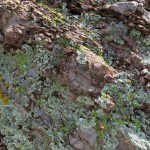 The clouds gradually broke up as I headed back, and sunlight brightened the colors of lichen on the outcrops above me.
