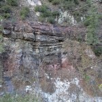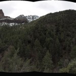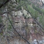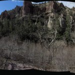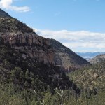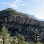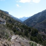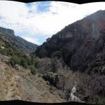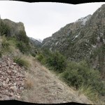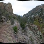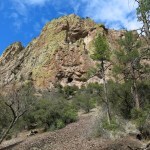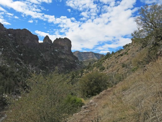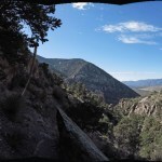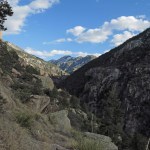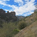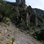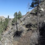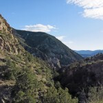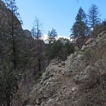 Climbing back out of the side canyon, you find yourself traversing the north slope of the main canyon below isolated outcrops, with the creek roaring far below. Across the canyon on your right loom nearly sheer cliffs. Eventually you encounter switchbacks that take you down toward the creek.
