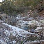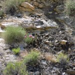 This is very dry country. I could see snow on northwest slopes down to about 5,400 feet, but I was surprised to meet running water in the wash – bedrock was close to the surface, and when it emerged, there were interesting water-sculpted features and cascades.