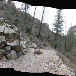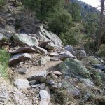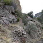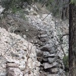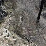 Past that road, the trail climbs higher and higher above the creek, meeting the wilderness boundary after another third of a mile. Now the canyon was beyond spectacular – but clouds were darkening the sky overhead. I began noticing how much work had once been put into building this trail, across talus slopes, rock faces, and slopes of loose dirt. I’d never seen a trail anywhere in this region that had been built like this – with dry-stone retaining walls up to fifteen feet tall supporting terraces up to 80 feet long, and walkways across gullies reinforced with one-inch rebar and heavy wire mesh. By contrast, our recent trail crew had only been able to clear a temporary path that would wash out at dozens of gullies in the next heavy rain.