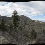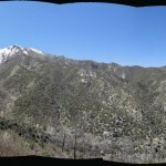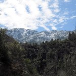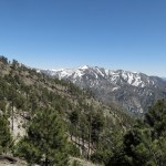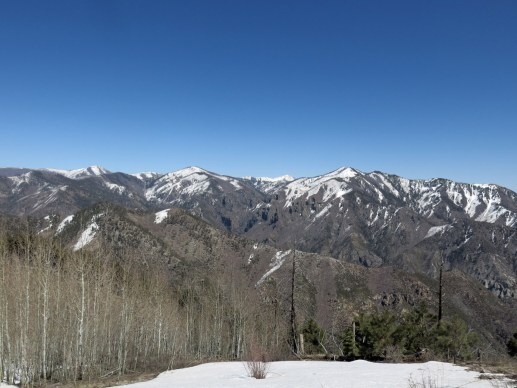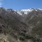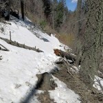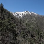 In the canyon bottom, I found some recent deadfall blocking the trail – the first I’d encountered today. Here, at about 6,200 feet elevation, shade had kept snow from melting, and I found the very recent tracks of two hikers and a dog. They ended at the first creek crossing in the entire distance of this trail so far – where I would have to stop as well. The trail crew had stopped here, but the old, abandoned trail continues for another ten miles, climbing to the 10,000 foot crest just below the highest peak in the range. From the highest parts of the trail, I could just glimpse that crest, its deforested, snow-blanketed slopes glittering in occasional sunlight.