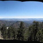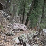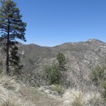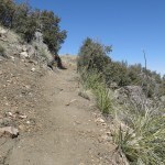 It was chilly in the canyon, but I expected a high in the 70s in the afternoon. I made good time climbing the steep section through the dark forest, out of the canyon to the five-way trail junction at 8,000 feet – the four-mile point. Just past that, on the forested traverse across the next watershed, I stepped aside for a thirty-something trail runner, a guy who’d gone up to the peak with his dog and was returning – a pretty good run at twelve miles and almost 3,000 feet of elevation.