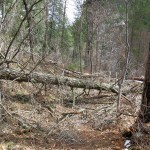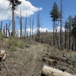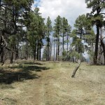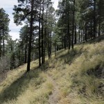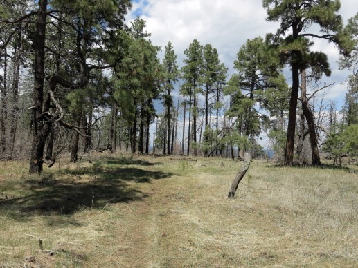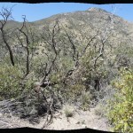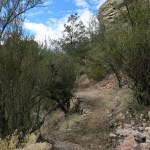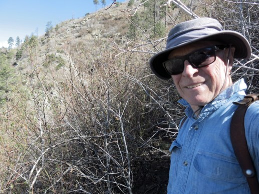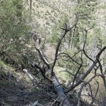 But these Arizona post-fire thickets had long, slender trunks and branches that grew high overhead and arched over the old trail, interlocking from both sides so I had to walk with my arms upraised and head bent forward so my hat would keep the branches out of my eyes. My hands ended up covered with scratches, but since long stretches of overgrowth alternated with clear stretches, I kept going.