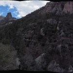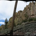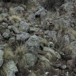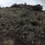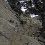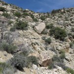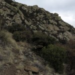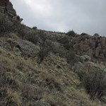 I wasn’t happy about it, but I fought my way up through storm, thickets, and boulders, eventually emerging on a more open slope where I could see more sheer caprock above. I had to keep traversing and gaining elevation while staying below that.
