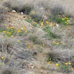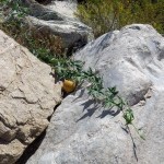 By the time I hit the trail in the mouth of the canyon at 9:15 am, it was already warm enough that I had to unbutton my shirt. The sweat was dripping off me as I labored up the steep, rocky trail over the shoulder into the tributary canyon. Spring flowers were exploding, but I was discouraged to notice isolated patches of invasive brome grass even within the wilderness study area, which hasn’t been grazed in decades. Other than that, the vegetation here is remarkably wild.
