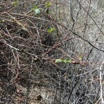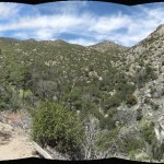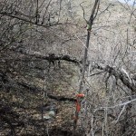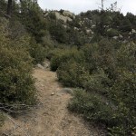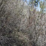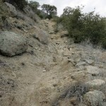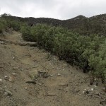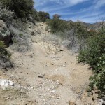 Last time, I’d ventured less than 200 yards on the trail into the new canyon, where as I mentioned above, a trail crew had cut brush. But now I discovered their work ended right beyond the point I’d reached before. Beyond that, the trail was overgrown with shrubs, blocked by deadfall, and in many places the old tread was completely eroded away – all 1,000 vertical feet of it.