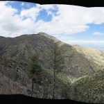 I next emerged into a basin where more drainages converged, and far above, I could see what appeared to be the crest, dotted with more pines. I wasn’t sure which route to take from here, so I climbed a rock formation a hundred feet or so above the wash, where I could get a panoramic view.