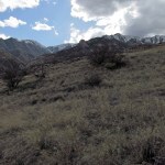 The main drainage came steeply down from a saddle that seemed to be on the crest, but I couldn’t tell if it would overlook the east side of the range or only the main canyon to my north. Also, the slopes of that drainage were really rocky and potentially hard to traverse. To the right was a slope that featured stretches of grassy ground, potentially easier to traverse, until the route vanished over a divide into a side drainage that seemed to lead to a higher saddle. I was sure that route would lead to the true crest, so that’s the one I would try.