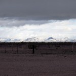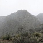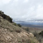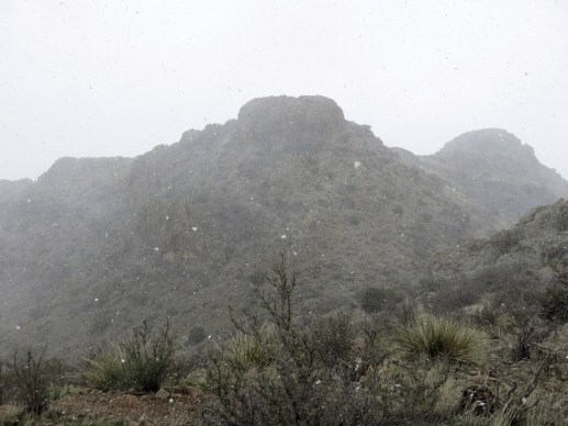 The slope I’d scouted turned out to consist of loose rock lined with agave and prickly pear, dissected by narrow, deep gullies – one of the most hazardous hikes I’ve ever done. And shortly after I reached it, dark clouds closed in and sleet began to fall. I was now crossing the state line into Arizona.