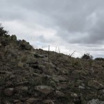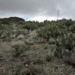 I started clambering up through the maze, hoping the summit lay somewhere above me. Another storm was forming. A tiny voice kept saying I should turn back before I got in real trouble, but I seemed to be on autopilot. I literally threw myself into thickets of stiff brush, clambering over them on all fours like some kind of giant beetle. Finally I emerged into the head of the narrow gorge, and thought I saw a way up it to the crest. It turned out to be a rockfall just wide enough for me to climb up, and at its top I emerged onto a gentle slope across the top of which ran a fence.