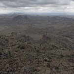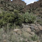 I cut northeast toward the mouth of the canyon I wanted, over a broad stony debris field cut by meandering sandy washes – tough and slow walking. I reached another fence and had to crawl under it where it crossed a wash. Eventually I reached an alluvial fan covered with catclaw, mesquite, and prickly pear that rose gently toward a low divide. I was able to follow a wash partway, then at the end, picked my way up a difficult slope lined with sharp volcanic rock and masses of prickly pear.
