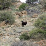 With the fence between us, I yelled at it to move, with no effect. I was in no mood to wait, so I passed through the gate, but on the other side I caught my sleeve on a prickly pear cactus. Standing about twenty feet away, the bull watched me, unconcerned, as I cursed and struggled out of my sweater. By the time I’d picked the tiny glochids out of my elbow, I was more pissed at myself than worried about the bull. It was a young one anyway, and hornless, and it had resumed grazing, ignoring me. I’m still getting used to these local bulls – so far they’ve seemed to lack the aggression of our desert bulls.