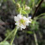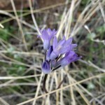 Past the trail junction, paying more attention to my surroundings, I discovered a few more early flowers. The grassy slopes enabled clear views, and far below me I watched a white-tailed buck crossing between clumps of oak. And when I finally reached the livestock fence with its hikers’ gate, what did I see on the other side but a bull, blocking the trail!