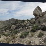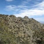 Dropping back into the wash farther upstream, I reached a stretch of rugged ground congested with boulders, thorns, and cactus that took some getting through before reaching the grassy slope I hoped to take to the crest. This required a steep climb, but there were parts that almost hinted at a trail, and dramatic rock formations both near and far as landmarks to memorize for my return.