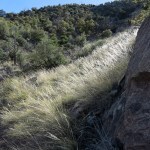 The trail was steep from the beginning. The overall average grade is almost 14%, making it one of the steepest long trails around, with a lot of short climbs in the 30% – 40% range. I soon came to a gate past which the vegetation changed dramatically, and I understood why the broad slopes above are blanketed with stands of tall native grasses – cattle have been fenced out of this entire watershed.