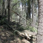 For the next hour, I pushed my way through thickets, crawled under fallen logs, stepped high over the outstretched branches of deadfall crowns, and inched carefully across steep slopes of loose dirt where the old trail had completely collapsed. One blessing was a scarcity of thorny locust, the scourge of higher elevation burn scars back home, but there was still enough to damage my new shirt and canvas pants.
