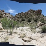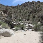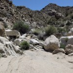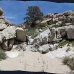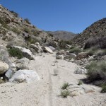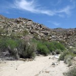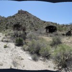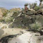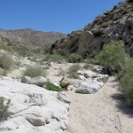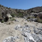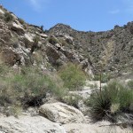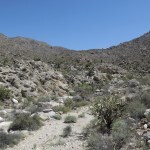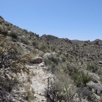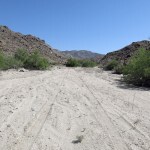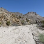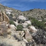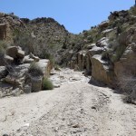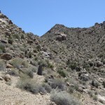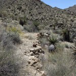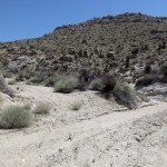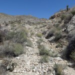 Past the dry waterfall, I was approaching the old miner’s cabin, which used to be maintained by a family of gun nuts from Huntington Beach. The truck had to turn back early, but the dirt bikers and ATV rider drove up the banks to avoid boulders in the wash, trampling vegetation, until they reached the base of the old, deeply eroded road to the cabin. And that turned out to be just too rugged for them.