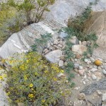 Having reached the cabin, I remembered that an old, now-impassable road climbs behind it to mine works and a roofless drystone cabin farther up the canyon. I went a short way up that and discovered a developed mule trail with stone retaining walls branching off, appearing to lead into the next canyon south. This is a canyon I backpacked into and partially explored more than thirty years ago, but I remember nothing of its upper reaches. It’s hidden from below, which makes it doubly intriguing, so I made a snap decision to follow the old trail.