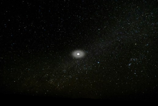 Near the end of the road, surrounded by the low, rounded silhouettes of dark junipers and pale boulders, I happened to glance north, and saw a hazy light in the sky, moving slowly from north to south, without making a noise. I couldn’t tell how high it was, but all round it, the stars were crystal clear and sharply defined. I could clearly see the tiny lights of jets crossing east to west behind it, but this light was much larger, and surrounded by an elliptical haze – an aura. Since the sky around it was clear, it was like the light was generating and illuminating its own haze – some sort of gas or vapor.