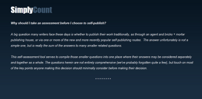 As I've put a lot of time into this assessment tool's development, some time in the future, I may charge a minor fee for its use. But as it is currently new, largely untested, and probably not as comprehensive as it could be, I'm making this version of the self-publishing assessment tool available for free. Try it out for yourself and see if you are a good fit for self-publishing.