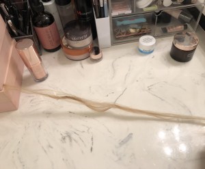 I’ve had the Conair Pro for almost three years and have never had a problem. It was all going well- my whole head was curled- until I realized one piece hadn’t curled. I sucked it into the curler and IT. GOT. STUCK. That’s right. My ridiculously long hair (that I love and work hard to keep healthy) got stuck in the darn thing. I yanked the plug out of the wall and spent ten minutes trying to get it out and then was near tears as I realized it wasn’t going to happen. With no other options I had no choice but to cut my hair off. Below is a pic of my Conair Pro with the piece of hair once I managed to yank it out (after I cut it)