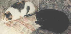 Meet Cercie (right) and Boots. Boots had a personality that no other cat could match. He came to us as a starving stray. Cercie who is spoiled rotten, let him come in and eat.. That was 15 years ago. He never left. He was a friend to all. One evening while sitting in the office working on our computers ( they are in the basement office) I heard a noise outside the window were Boots & Cercie usually come in. Looking in at me was a huge pair of glowing eyes. I thought Boots was wanting in so I went to the window to see two pairs of eyes staring at me. There was Boots and a raccoon standing beside him, both looking in the window together. What a site. Well accept one cat who terrorized him hE was so friendly that he didn’t realize how mean this other cat was. Because of this other cat he had several surgeries. One of the surgeries consisted of having his tail removed. This sound weird but if you knew Boots you would think he looked funny WITH A TAIL Each time he came so very close to death Ron would spoon feed him back to health. We tried to talk to the family of this other cat but they were not the listening kind. We could not keep Boots in the house at all times as he had been a stray. The vet said he would think we were punishing him. The last time he got bit he got another infection and finally we had to have him put down Christmas Eve 2003. This broke our hearts. We all miss him so much. He had away of opening up the front door to come in. Sometimes I hear the door and expect to see him. He would chew on my hair and lay on my head. What I wouldn’t do to have him here to do that again.