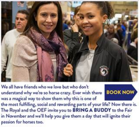 It’s an honour to be part of an initiative between the Royal, and Ontario Equestrian, called the “Bring a Buddy” program, designed to give equestrian enthusiasts a way to introduce their friends and family to the sport.