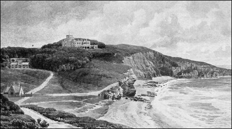 This is a picture of Southerndown beach as it would have been decades ago, when Dunraven Castle was perched on the cliffs above it. My husband had been to Southerndown as a child and a teenager, but he didn’t know anything about Dunraven Castle, so it was just by chance that we walked far enough to discover its walled gardens.