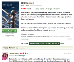 Just a quick post today to let you all know that I’m going to start a series of posts on demystifying the social media things that are in my writerly world. I’ll be starting with Goodreads. I’ve had an author page there for a while, but I’ve never utilized it fully and to be honest, despite the fact that most things on the web don’t baffle me, Goodreads overwhelms me. So I’m facing it this weekend, setting up my J. Kenner page, and learning the ropes.