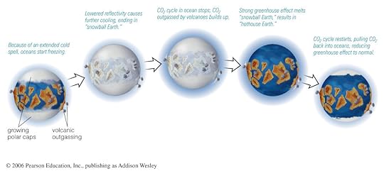 El dióxido de carbono es un gas con un papel esencial en el efecto invernadero de nuestro planeta. Mientras desaparecía a pasos agigantados engullido por el agua de las incesantes lluvias que caían sobre la superficie de la tierra, las temperaturas empezaron a descender de forma alarmante, hasta alcanzarse varias decenas de grados por debajo de cero, incluso en los trópicos. Comenzó a proliferar el hielo y la radiación procedente del Sol escapaba al espacio en un proceso de autoalimentación cada vez más acusado. Tuvieron que ser, una vez más, los volcanes, los que devolviesen a la Tierra a un estado más cálido al ir liberando continuamente más y más dióxido de carbono que ya no era eliminado por la lluvia, pues el planeta entero se hallaba cubierto de hielo. Al aumentar de nuevo la temperatura global, el hielo se fundió rápidamente y se evaporaron inmensas cantidades de agua que contribuyeron, más aún, al efecto invernadero desbocado. El agua muy caliente de los océanos tuvo que provocar, necesariamente, huracanes de proporciones épicas.