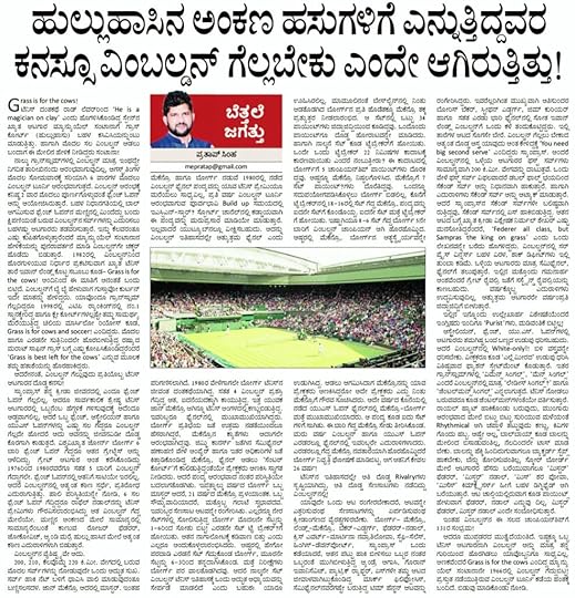 ಆದರೂ ಮುಪ್ಪಡರದ ಮುತ್ತೈದೆಯಂತಿದೆ. ಇಷ್ಟಕ್ಕೂ ಒಬ್ಬ ಟೆನಿಸ್ ಆಟಗಾರನಾಗಿ ವಿಂಬಲ್ಡನ್ ಅನ್ನು ಮಾತ್ರ ತನ್ನ ಗುರಿಯಿಂದ ಹೊರಗಿಡಲು ಯಾವೊಬ್ಬನಿಗೂ ಸಾಧ್ಯವಿಲ್ಲ. ಅಣಕವೆಂದರೆ Grass is for the cows ಎಂದಿದ್ದ ಮ್ಯಾನ್ಯುಯೆಲ್ ಸಂಟಾನಾನೇ 1966ರಲ್ಲಿ ವಿಂಬಲ್ಡನ್ ಗೆದ್ದುಬಿಟ್ಟ! ಪ್ರಸ್ತುತ ನಡೆಯುತ್ತಿರುವ ವಿಂಬಲ್ಡನ್ ಟೂರ್ನಿ ಕಡೆಯ ಹಂತಕ್ಕೆ ಬಂದಿದೆ. ಬಿಡುವು ಮಾಡಿಕೊಂಡು ನೋಡಿ.